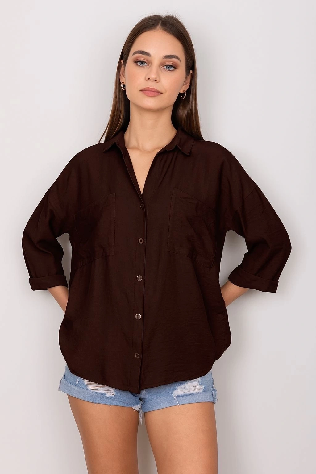 Cepli salaş gömlek koyu kahve renk seçeneğiyle şıklığı ve rahatlığı bir arada sunuyor.