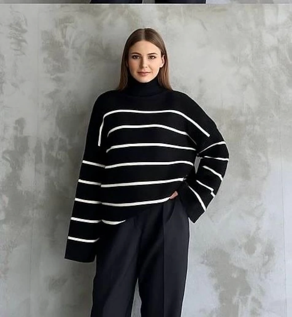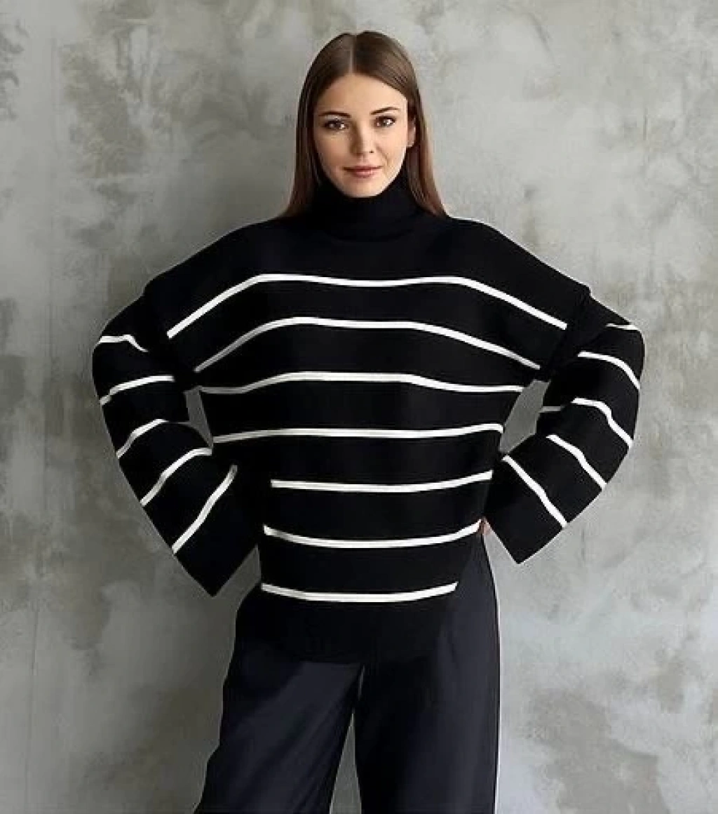 • Çizgili ispanyol kol triko boğazlı kazak siyah elf