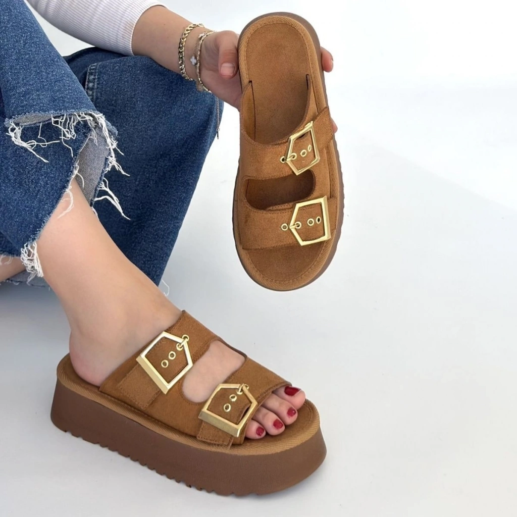 • Coer Taba Süet Çift Tokalı Terlik