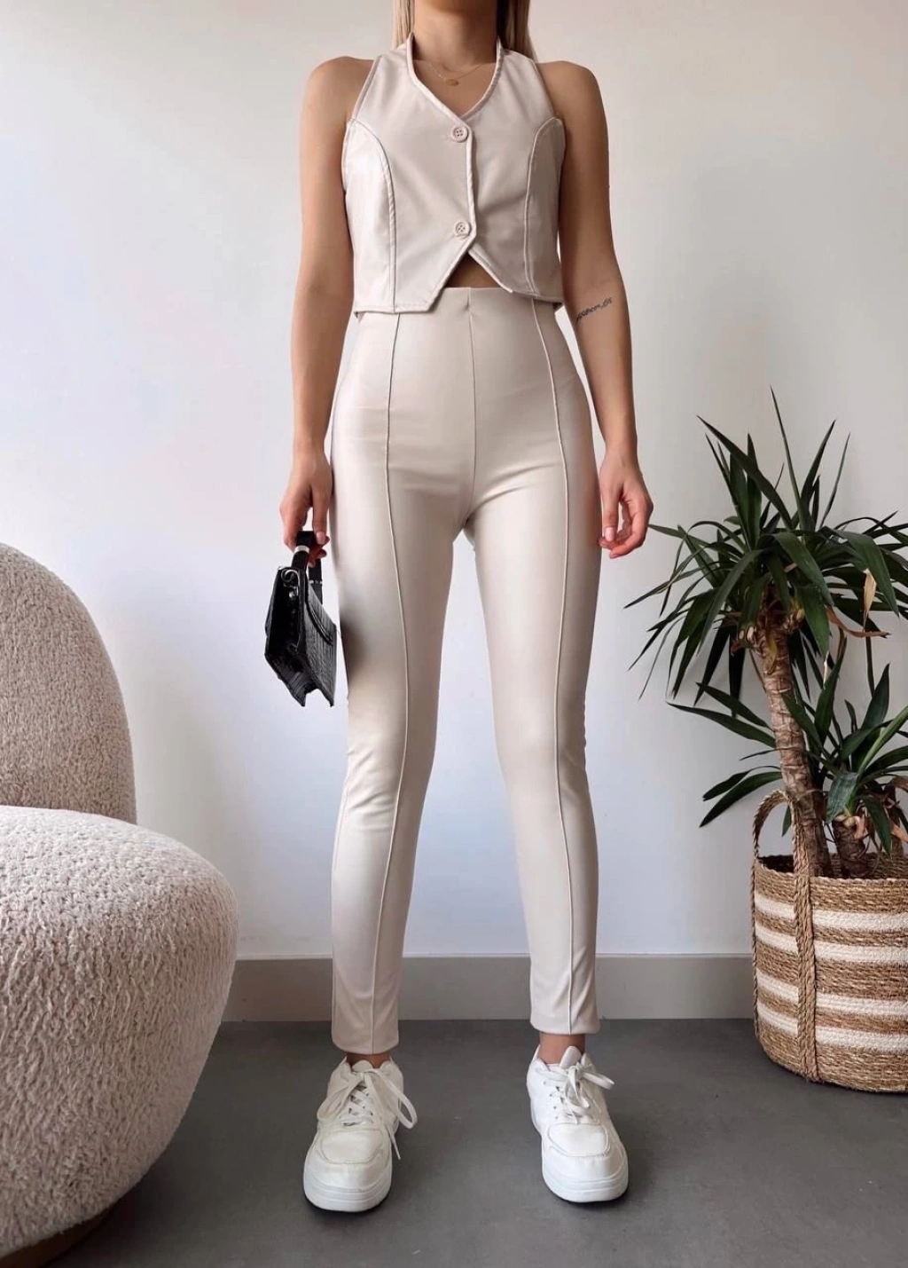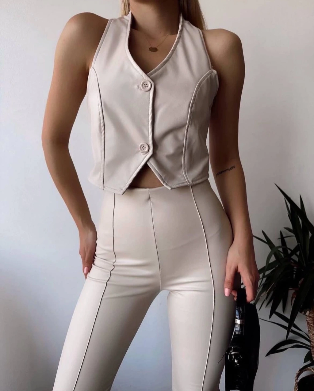 İki düğmeli deri yelek krem s243001, kadın giyim kategorisinde şıklık ve zarafet arayanların tercihi. İşte bu yeleğin özellikleri: