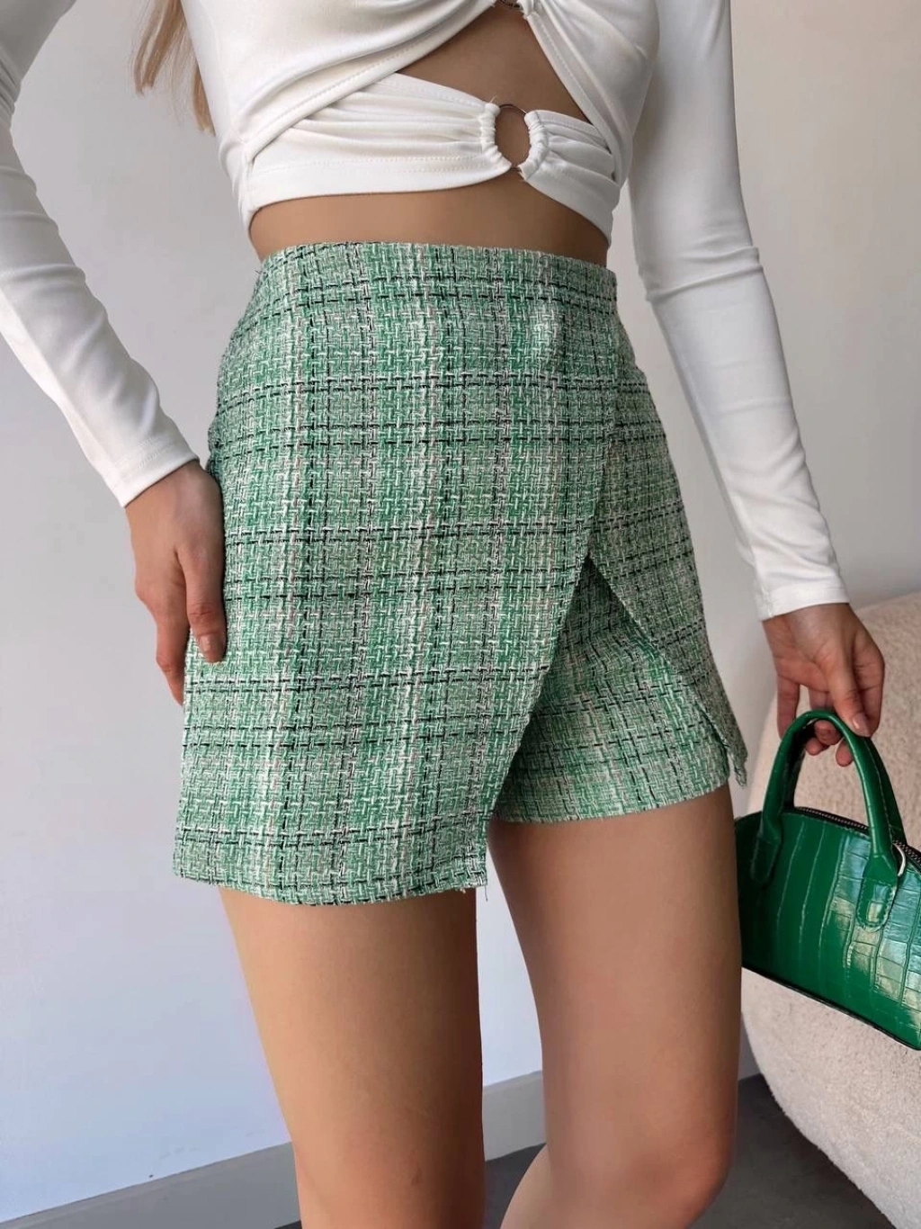 Şık ve rahat tasarımıyla dikkat çeken Kapaklı Tüvit Şort Etek Yeşil, gardırobunuzun vazgeçilmez parçalarından biri olmaya aday.
