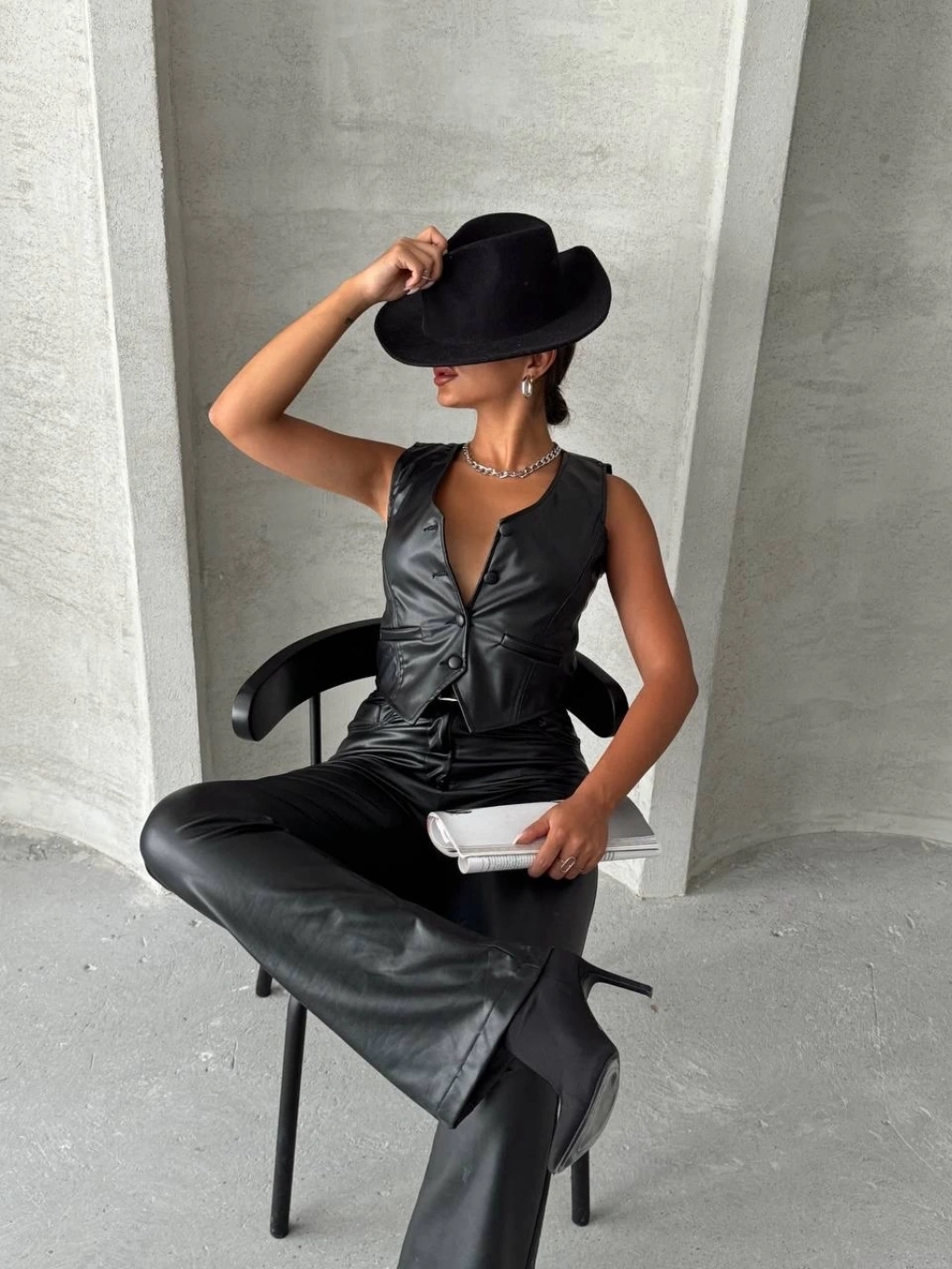 Kaplama düğmeli deri yelek siyah s24398